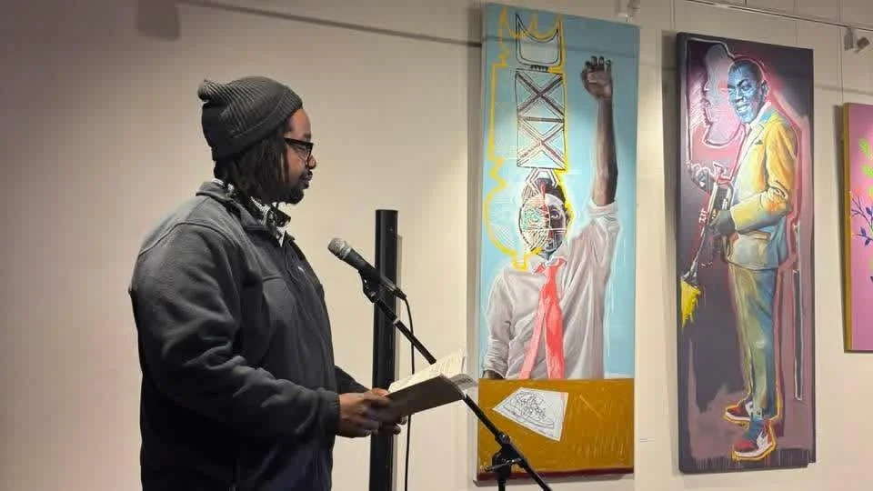 Event poster for a writers' read featuring diverse speakers, with a background of group of people speaking or performing.